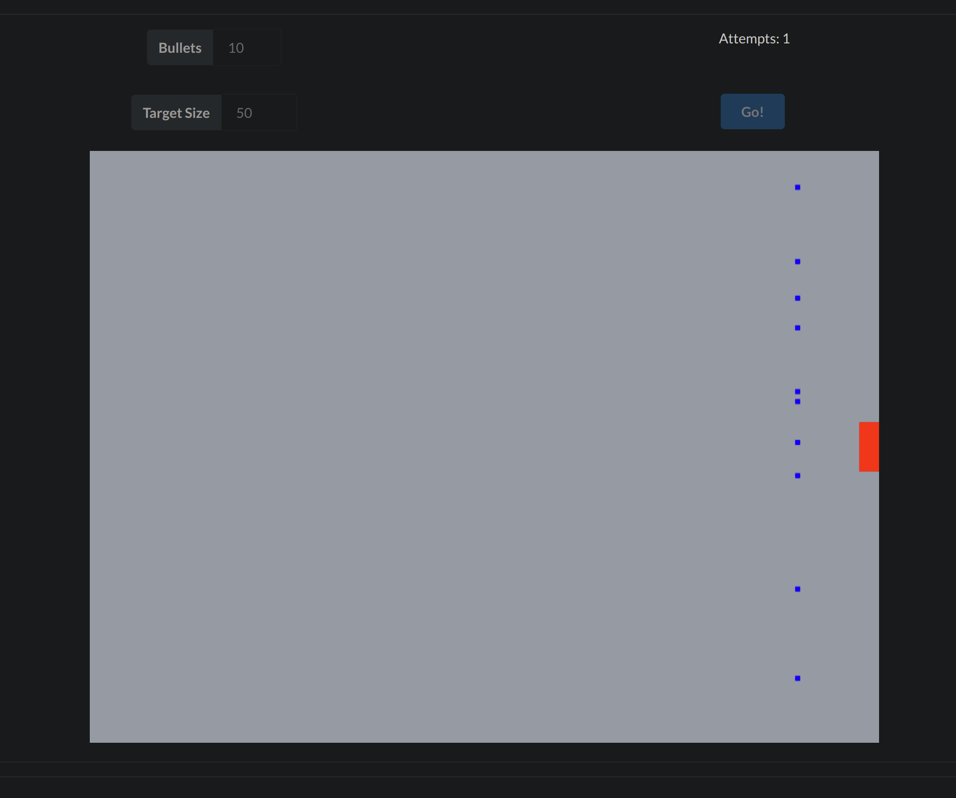 To visualize this concept, I’ve built a minigame. Imagine you’re in a bar with friends. You’re shooting darts at a target, but you’re all completely drunk. So drunk that only luck counts when you’re trying to shoot the dart at the target, no skills involved, only pure luck. You can change the number of friends shooting darts simultaneously and you can also change the size of the target. This way, you can manually play around with difficulty adjustment. Notice what happens to the number of attempts needed to hit the target as you adjust the difficulty.